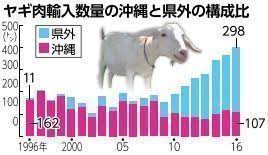沖縄地区税関が18日までにまとめたヤギ肉の輸入動向によると、これまで国内でヤギ肉の需要はほぼ沖縄だけだったのが、この数年で沖縄以外の県外港での輸入が急増し、2016年の全国に占める沖縄の輸入シェアは26・6%まで低下した。港別では、東京港と尼崎西宮芦屋港(兵庫県)が那覇港の実績を上回り、同税関は「かつてヤギといえば沖縄が100%のシェアを誇っていたが、県外での輸入量が沖縄を完全に超えている」と指摘した。